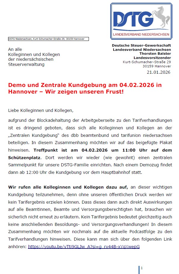 Aufgabe der DSTG Niedersachsen ist es, die berufsbedingten, politischen, rechtlichen, wirtschaftlichen und sozialen Interessen ihrer Mitglieder wahrzunehmen.