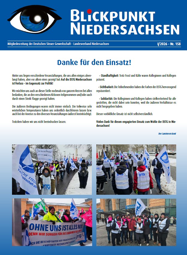 Das Magazin Blickpunkt informiert unsere Mitglieder schon seit 2001 über die aktuellen Themen der Gewerkschaft. Uns liegen seit der 29. Auflage im September 2001 alle Magazine im PDF-Format vor. Falls du ein bestimmtes Magazin lesen möchtest, das du hier auf der Website nicht zum Download vorfindest, schreibe uns einfach eine Mail an geschaeftsstelle@dstg-nds.de .